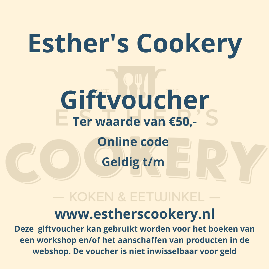 It is of course also possible to put a different amount on the gift voucher. Send an email to esther@estherscookery.nl with the desired amount and whether you want to receive the voucher via email or mail.